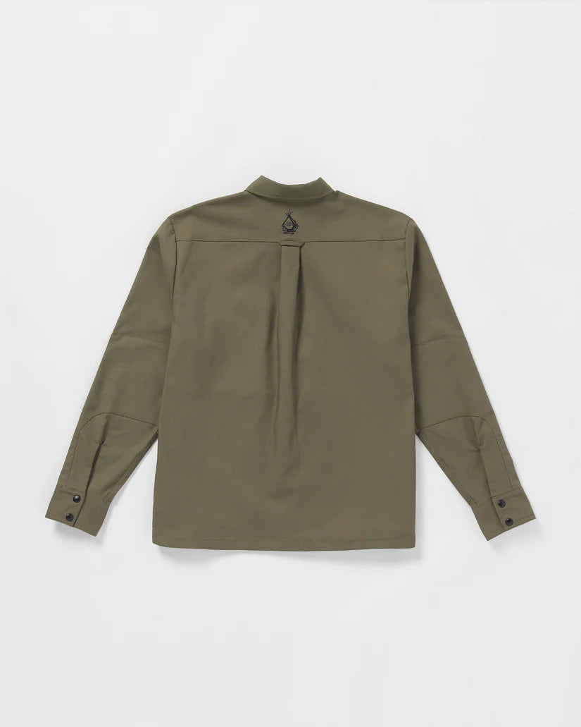 Bryan Iguchi, the legendary snowboarder, partnered with our Volcom design team to bring you the Tokyo True collaboration, blending his Japanese heritage and global cult following into a project that resonates universally. This work shirt is crafted from durable cotton-blend canvas that offers a touch of stretch of added mobility. Cut into a roomy boxy fit, it features nylon ripstop details for stronger durability, and a hidden zip-front placket for a sleek, modern look. Featured here in green.